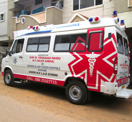 BMS Hitech Ambulance with single mould fibre interior for long life with CE and FDA certified medical equipments. Well equipped interiors with all safety features.